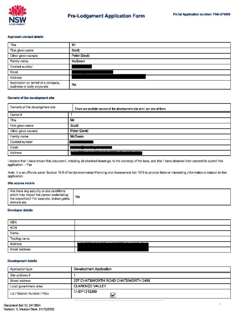 Get the free ECM2413924v1DA2022/0756 Generated Pre-DA form 237 Chatsworth Road CHATSWORTH NSW 246...