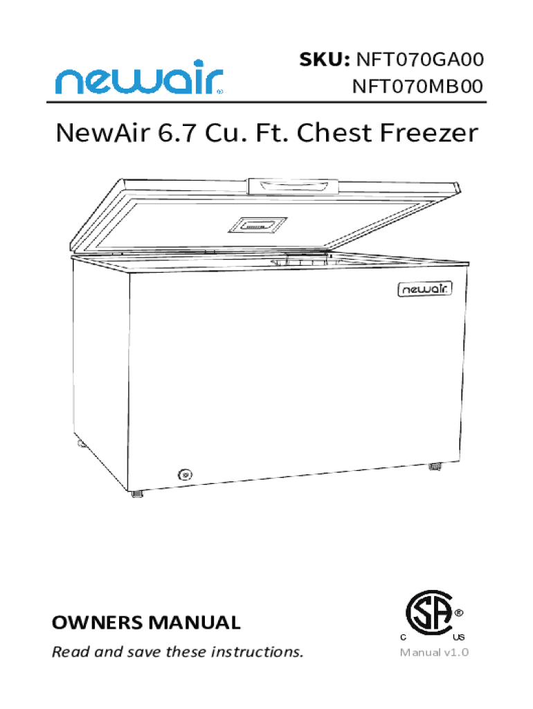 SKU: NFT070GA00 NFT070MB00NewAir 6.7 Cu. Ft. Chest FreezerOWNERS MANUAL Read and save these instructions. Manual v1.02READ AND SAVE THESE INSTRUCTIONS. TABLE OF CONTENTS Register Your Product Online...............................................................................