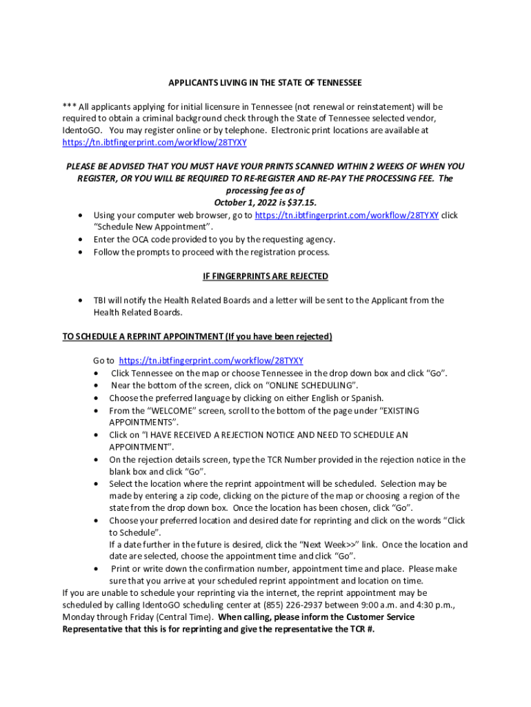 APPLICANTS LIVING IN THE STATE OF TENNESSEE *** All applicants applying for initial licensure in Tennessee (not renewal or reinstatement) will be required to obtain a criminal background check through
