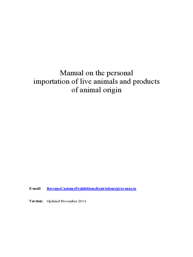 Manual on the personal importation of live animals and products of animal original:RevenueCustomsProhibitionsRestrictions@revenue.inversion: Updated November 2014Contents 1. INTRODUCTION....................................................................................................3