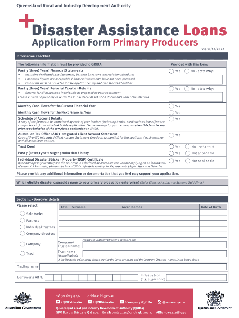 Queensland Rural and Industry Development AuthorityDisaster Assistance Loans Application Form Primary Producersv14 10/10/2022Information checklist The following information must be provided to FRIDA:Provided