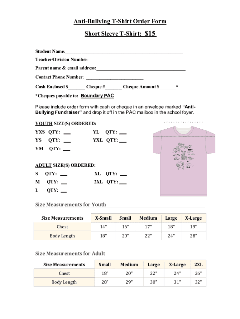 AntiBullying Shirt Order Form Short Sleeve Shirt: $15 Student Name:___ Teacher/Division Number: ___ Parent name & email address:___ Contact Phone Number: ___ Cash Enclosed $___ Check #___ Check Amount