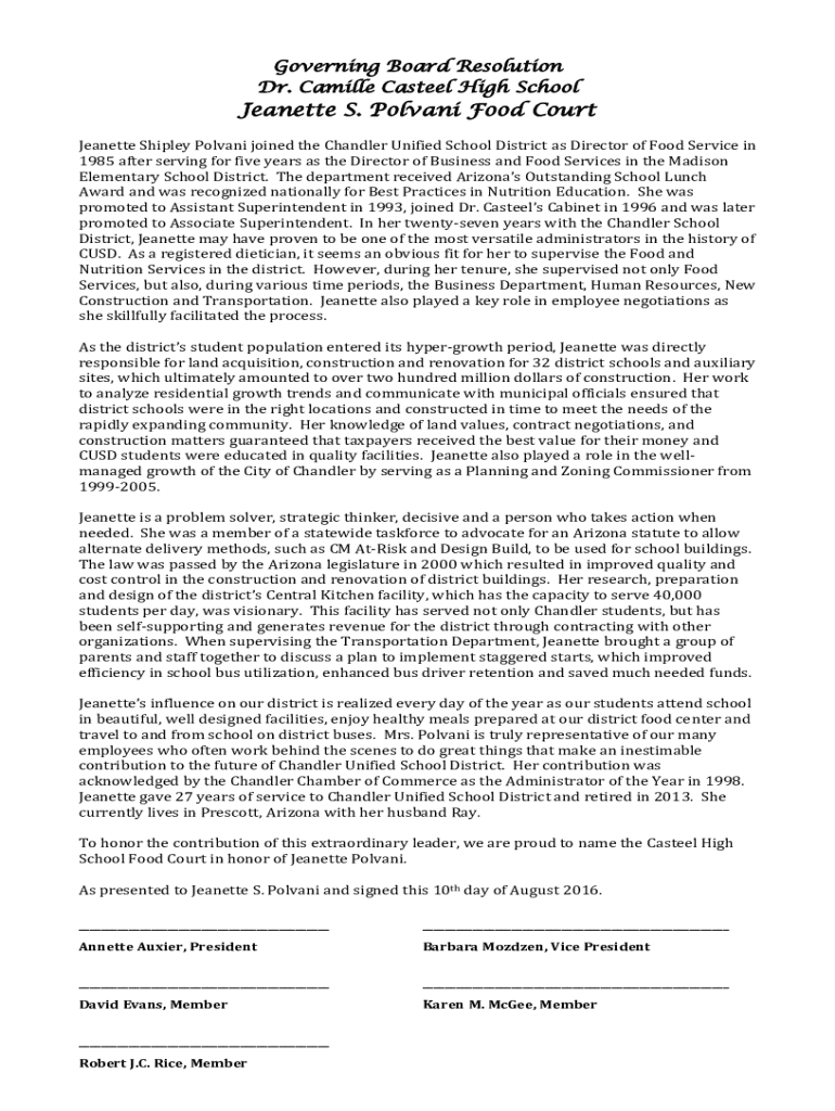 Governing Board Resolution Dr. Camille Ca steel High School Jeanette S. Poland Food Court Jeanette Shirley Poland joined the Chandler Unified School District as Director of Food Service in 1985 after