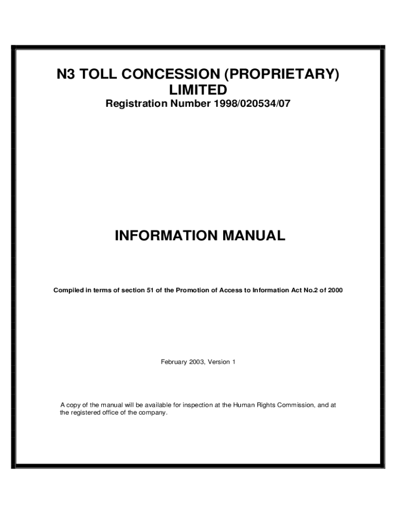 N3 TOLL CONCESSION (PROPRIETARY) LIMITED Registration Number 1998/020534/07INFORMATION MANUALCompiled in terms of section 51 of the Promotion of Access to Information Act No.2 of 2000February 2003,
