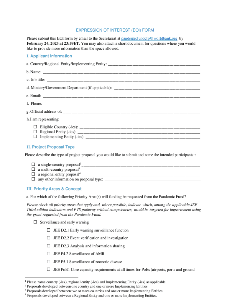 3 February 2023EXPRESSION OF INTEREST The Pandemic Fund intends to issue its pilot first Call for Proposals on March 3, 2023. The envelope of funding for the First Call for Proposals is estimated