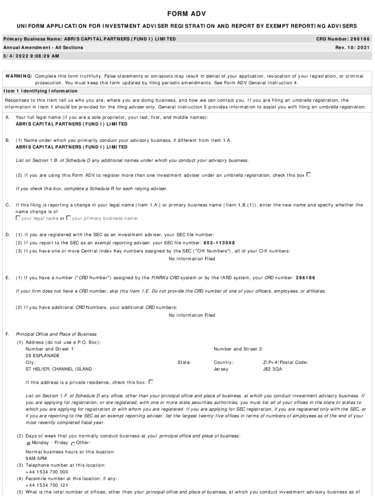 FORM ADV UNIFORM APPLICATION FOR INVESTMENT ADVISER REGISTRATION AND REPORT BY EXEMPT REPORTING ADVISERS Primary Business Name: ABIS CAPITAL PARTNERS (FUND I) LIMITED CRD Number: 296186Annual Amendment