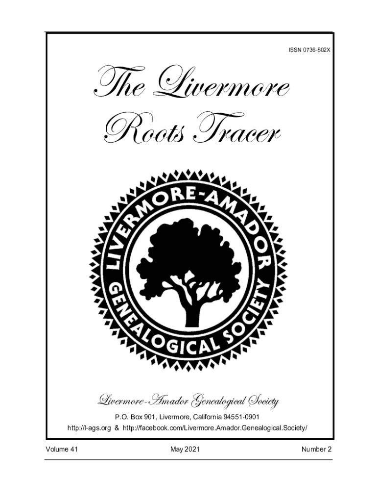The Livermore Roots Tracer ISSN 0736802XThe Livermore Roots TracerLivermoreAmador Genealogical Society P.O. Box 901, Livermore, California 945510901 http://lags.org & http://facebook.com/Livermore.