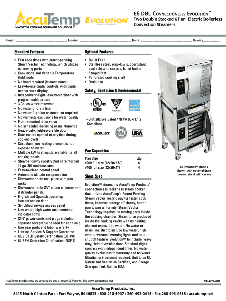 Convection SteamersProject: ___ Location: ___ Item #: ___ Quantity:___Standard FeaturesOptional