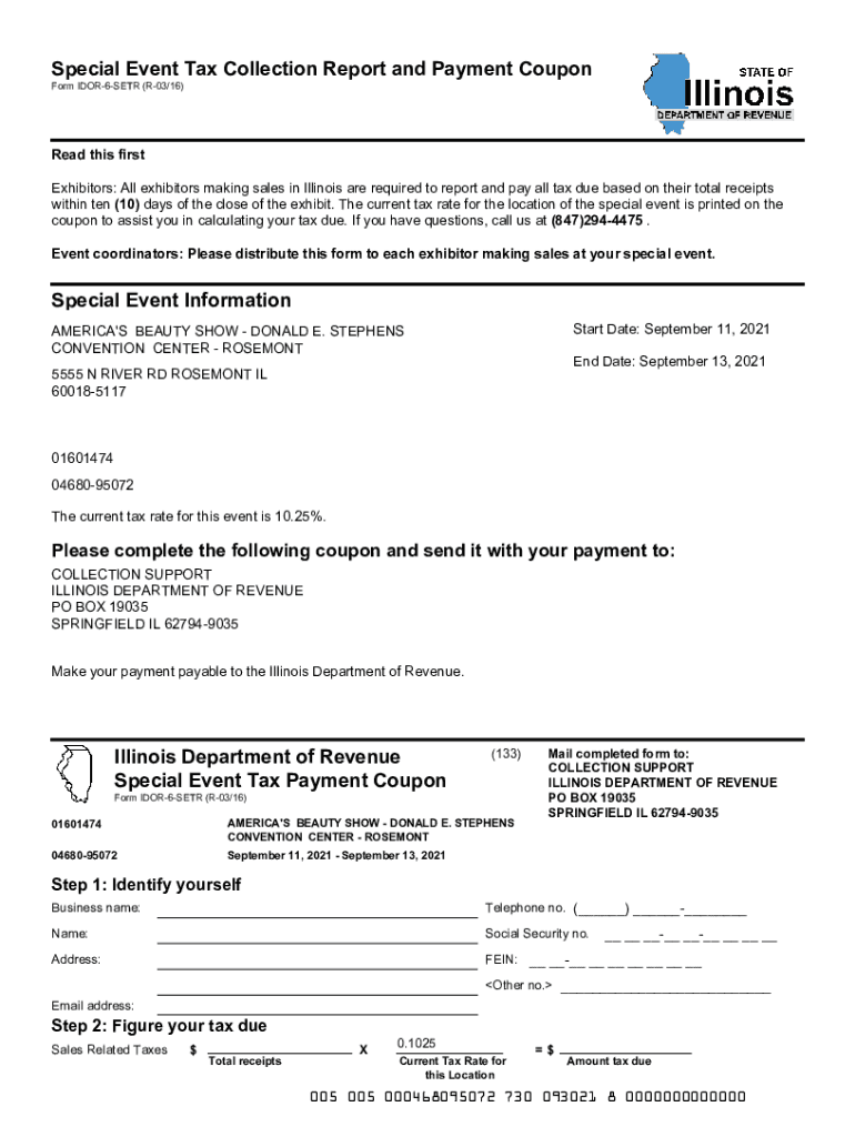 Notice for Special Event Reporting Requirements February 18, 2021COSMETOLOGISTS CHICAGO ATTN: MS. AMY WESTERMAN, SHOW MANAGER 5600 N RIVER RD STE 8000 ROSAMOND IL 600185114Letter ID: L1048469000You