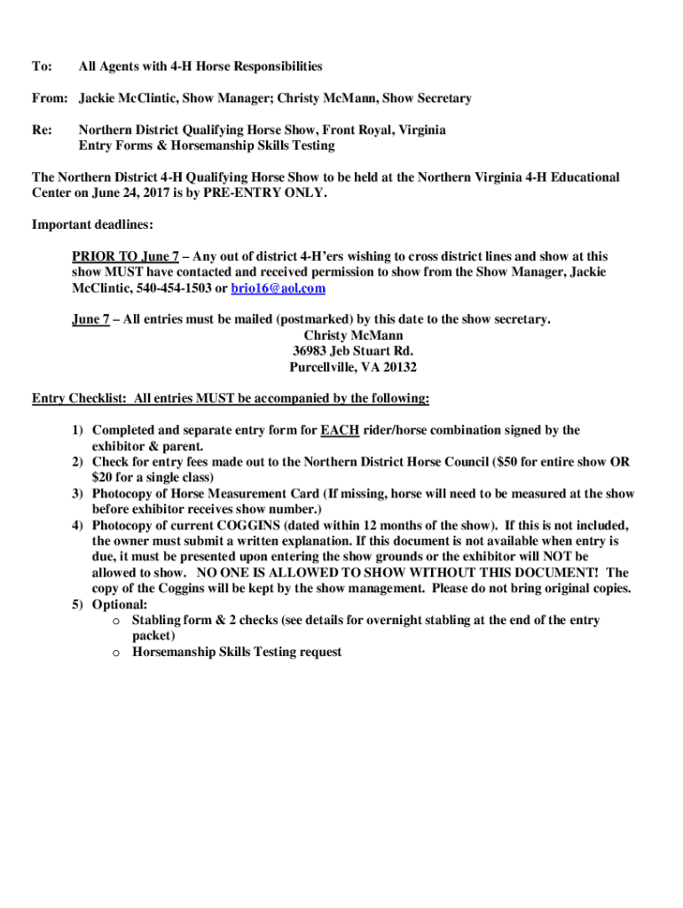 To:All Agents with 4H Horse ResponsibilitiesFrom: Jackie McClintock, Show Manager; Christy McCann, Show Secretary Re:Northern District Qualifying Horse Show, Front Royal, Virginia Entry Forms & Horsemanship