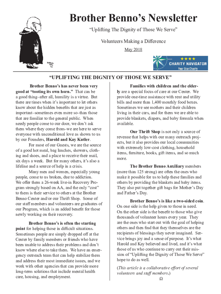 Brother Ben nos Newsletter Uplifting The Dignity of Those We Serve Volunteers Making a Difference May 2018UPLIFTING THE DIGNITY OF THOSE WE SERVEBrother Ben nos has never been very good at tooting