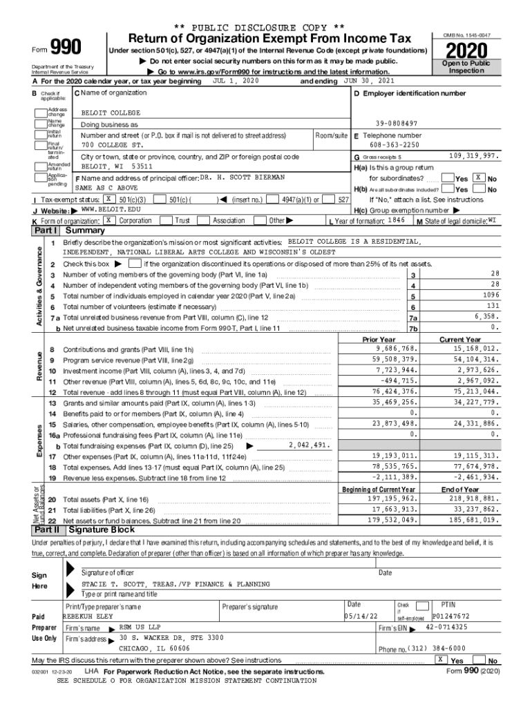** PUBLIC DISCLOSURE COPY ** Form990Return of Organization Exempt From Income Tax OMB No. 15450047| Do not enter social security numbers on this form as it may be made public. Open to Public Inspection2020Under
