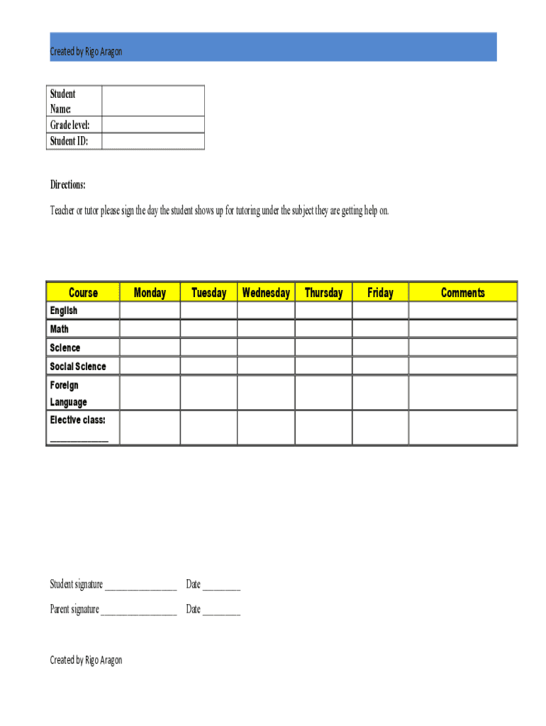 Created by Rico AragonStudent Name: Grade level: Student ID:Directions: Teacher or tutor please sign the day the student shows up for tutoring under the subject they are getting help on. Course English