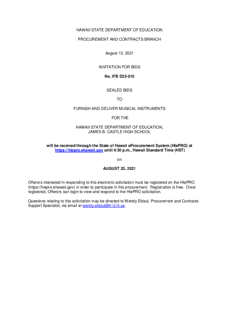 HAWAII STATE DEPARTMENT OF EDUCATION PROCUREMENT AND CONTRACTS BRANCH August 13, 2021INVITATION FOR BIDS No. IF D22010SEALED BIDS TO FURNISH AND DELIVER MUSICAL INSTRUMENTS FOR THE HAWAII STATE DEPARTMENT