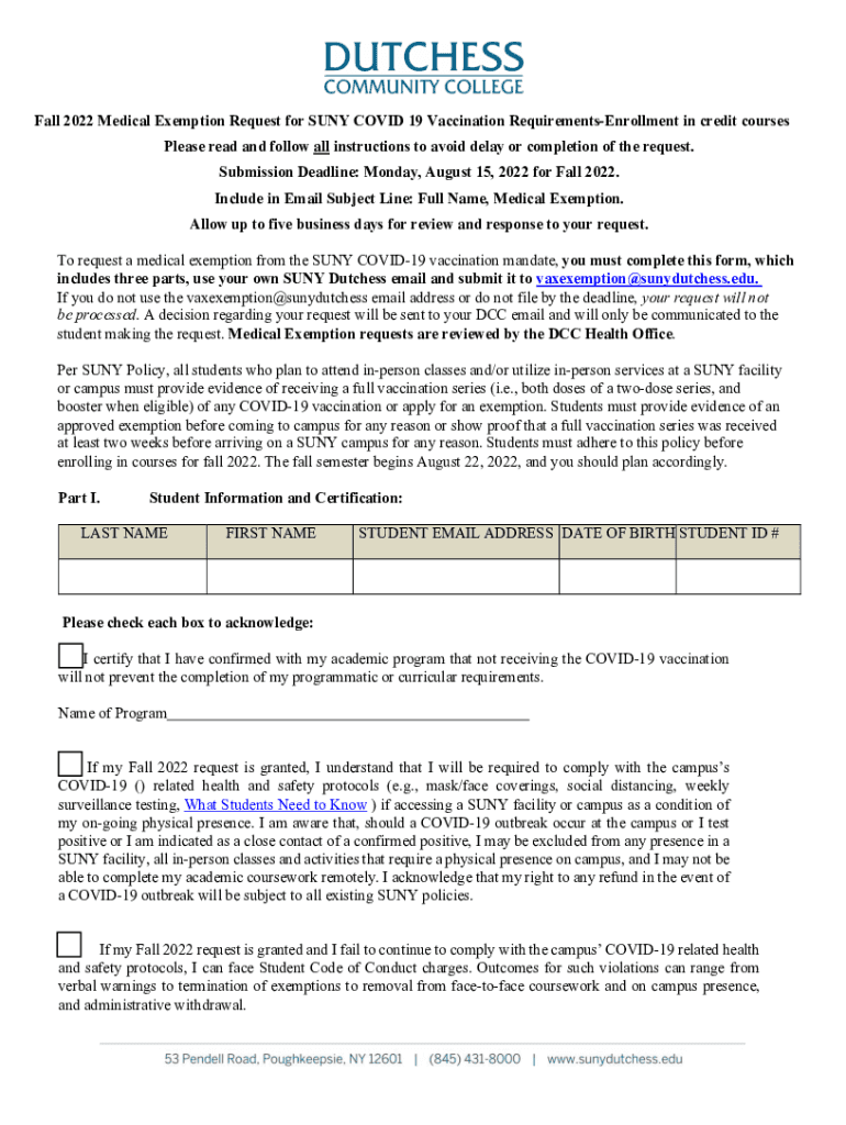 Fall 2022 Medical Exemption Request for SUN COVID-19 Vaccination RequirementsEnrollment in credit courses Please read and follow all instructions to avoid delay or completion of the request. Submission