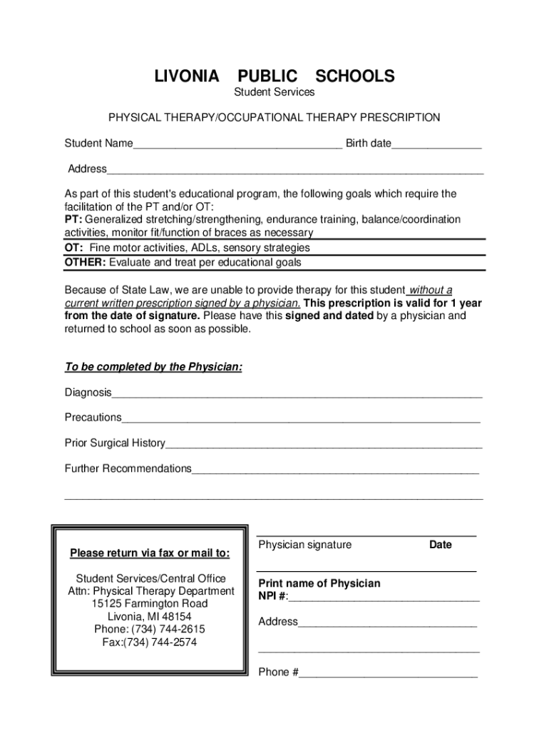 LIVONIAPUBLICSCHOOLSStudent Services PHYSICAL THERAPY/OCCUPATIONAL THERAPY PRESCRIPTION Student Name___ Birth date___ Address___ As part of this student\'s educational program, the following goals