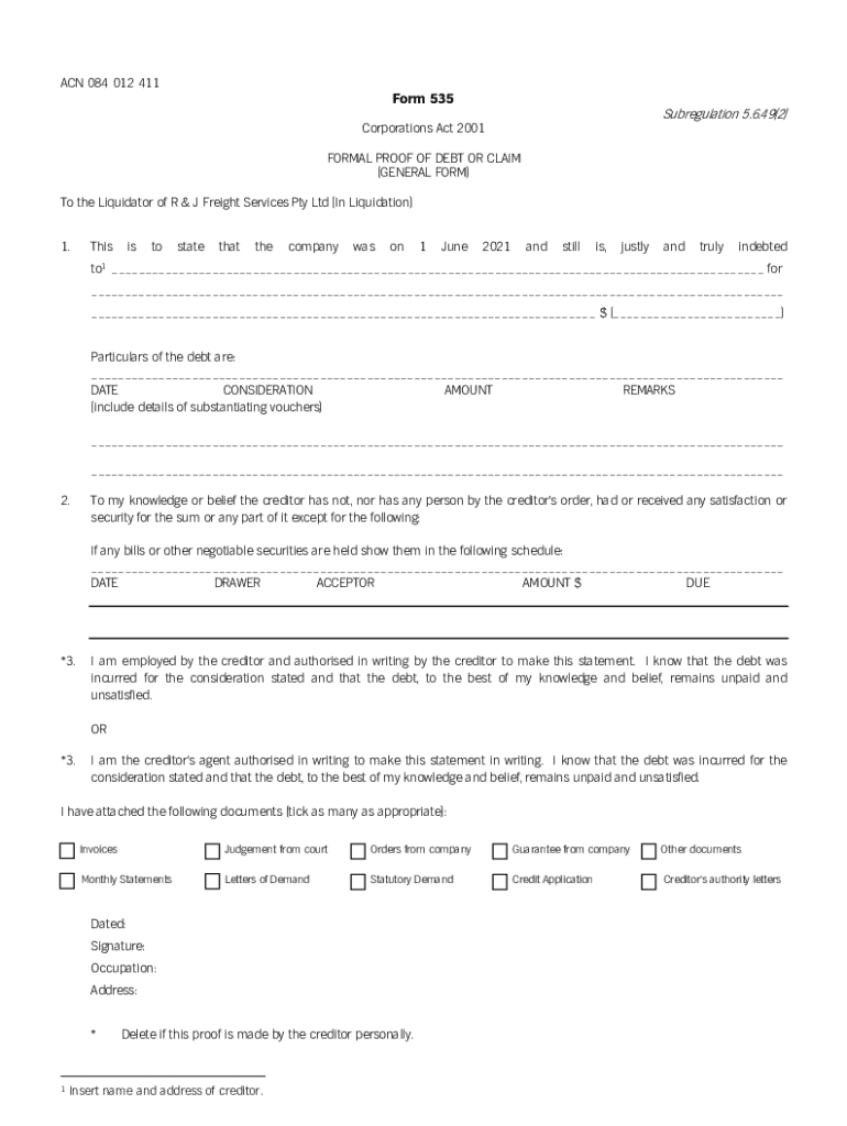ACN 084 012 411Form 535Subregulation 5.6.49(2)Corporations Act 2001 FORMAL PROOF OF DEBT OR CLAIM (GENERAL FORM) To the Liquidator of R & J Freight Services Pty Ltd (In Liquidation) 1. Thisistostatethatthecompanywason1June2021andstillis,justlyandtrulyindebtedto11___