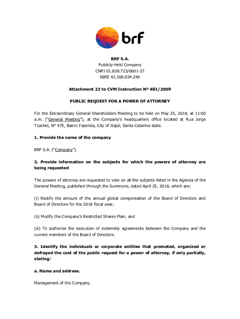 BRF S.A. PubliclyHeld Company CNJ 01.838.723/000127 NICE 42.300.034.240 Attachment 23 to CVM Instruction N 481/2009 PUBLIC REQUEST FOR A POWER OF ATTORNEY For the Extraordinary General Shareholders