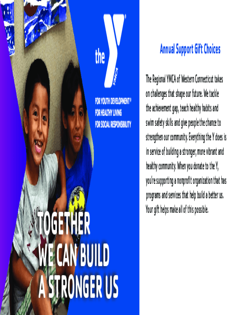 Annual Support Gift ChoicesTOGETHER WE CAN BUILD A STRONGER The Regional YMCA of Western Connecticut takes on challenges that shape our future. We tackle the achievement gap, teach healthy habits