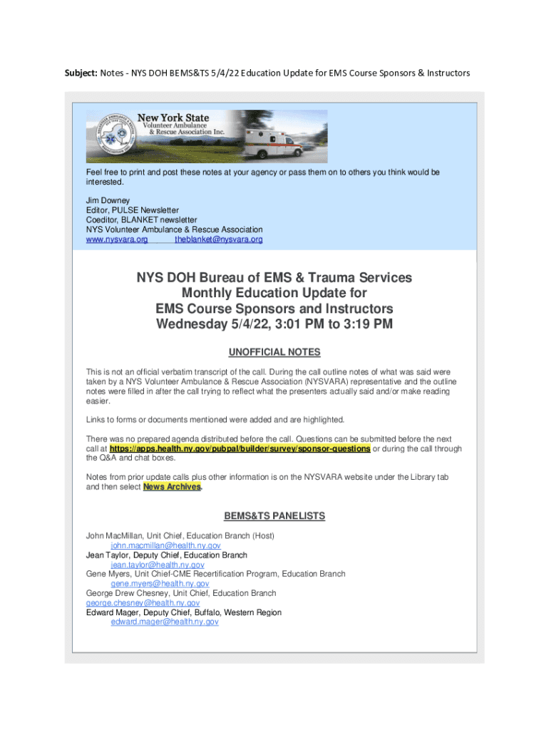 Subject: Notes NYS DOH BEASTS 5/4/22 Education Update for EMS Course Sponsors & InstructorsFeel free to print and post these notes at your agency or pass them on to others you think would be interested.