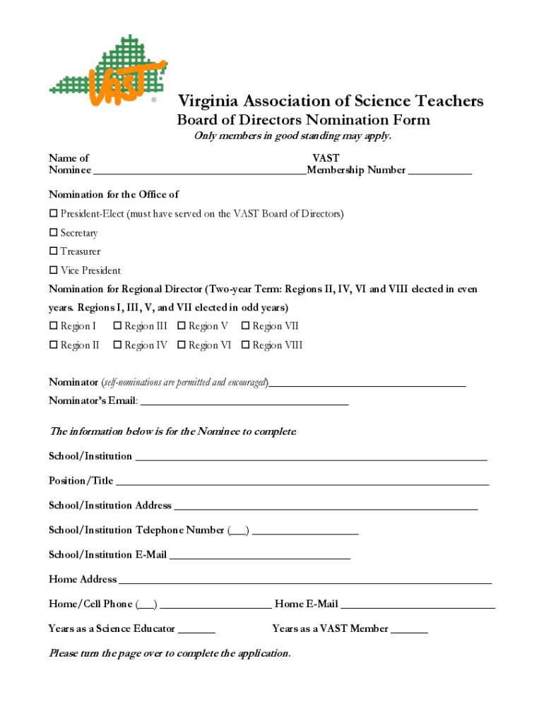 Virginia Association of Science Weatherboard of Directors Nomination Form Only members in good standing may apply. Name of VAST Nominee ___Membership Number ___ Nomination for the Office of o President-elect