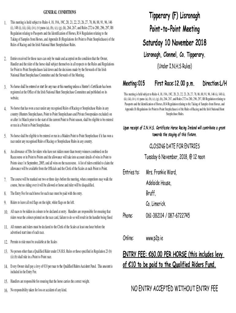 Tipperary (F) LisronaghGENERAL CONDITIONS 1. This meeting is held subject to Rules 4, 18, 19A, 19C, 20, 21, 22, 23, 26, 27, 78, 86, 88, 91, 96, 146 (i), 148 (i), (ii), (iii), (iv), (v) paras (a),