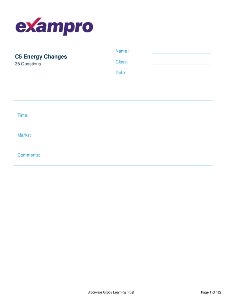 Name:___Class:___Date:___C5 Energy Changes 35 Questionnaire:Marks:Comments:Brook vale Group Learning Trust Page 1 of 1221Some students investigated the reactivity of four unknown metals, W, X, Y and