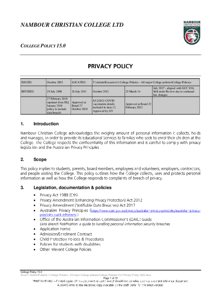 Parents or guardians of students attending Nambour Christian College are required to file appropriate enrollment forms.
