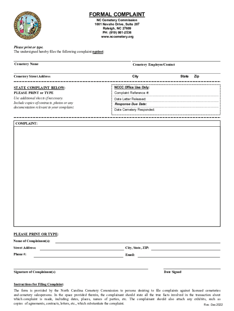 Get the free NCCC Complaint Form - North Carolina Cemetery Commission