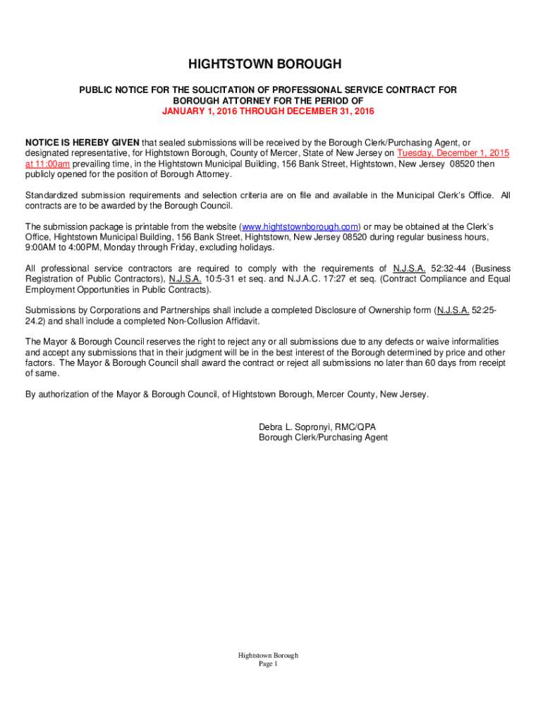 HIGHTSTOWN BOROUGH PUBLIC NOTICE FOR THE SOLICITATION OF PROFESSIONAL SERVICE CONTRACT FOR BOROUGH ATTORNEY FOR THE PERIOD OF JANUARY 1, 2016, THROUGH DECEMBER 31, 2016NOTICE IS HEREBY GIVEN that