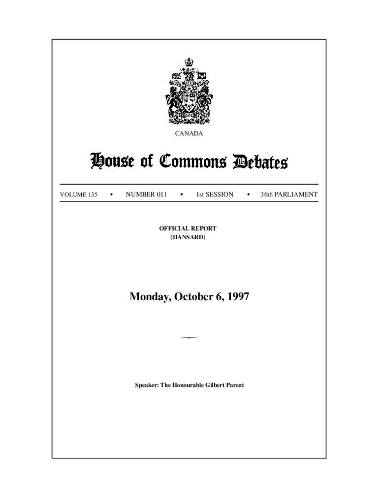 CANADAVOLUME 135SNUMBER 011S1st SESSIONSOFFICIAL REPORT (MANSARD)Monday, October 6, 1997Speaker: The Honorable Gilbert Parent36th PARLIAMENTCONTENTS (Table of Contents appears at back of this issue.)