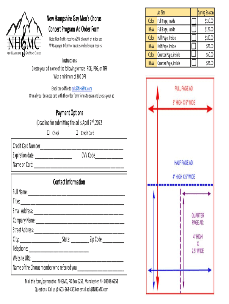 New Hampshire Gay Men\'s Chorus Concert Program Ad Order Form Note: Nonprofits receive a 25% discount on inside ads W9 Taxpayer ID form or invoice available upon requestInstructions Create your ad