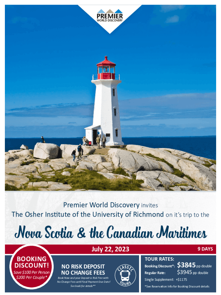 Premier World Discovery invites The Other Institute of the University of Richmond on its trip to the Nova Scotia & the Canadian Maritime BOOKING DISCOUNT! Save $100 Per Person $200 Per Couple×July