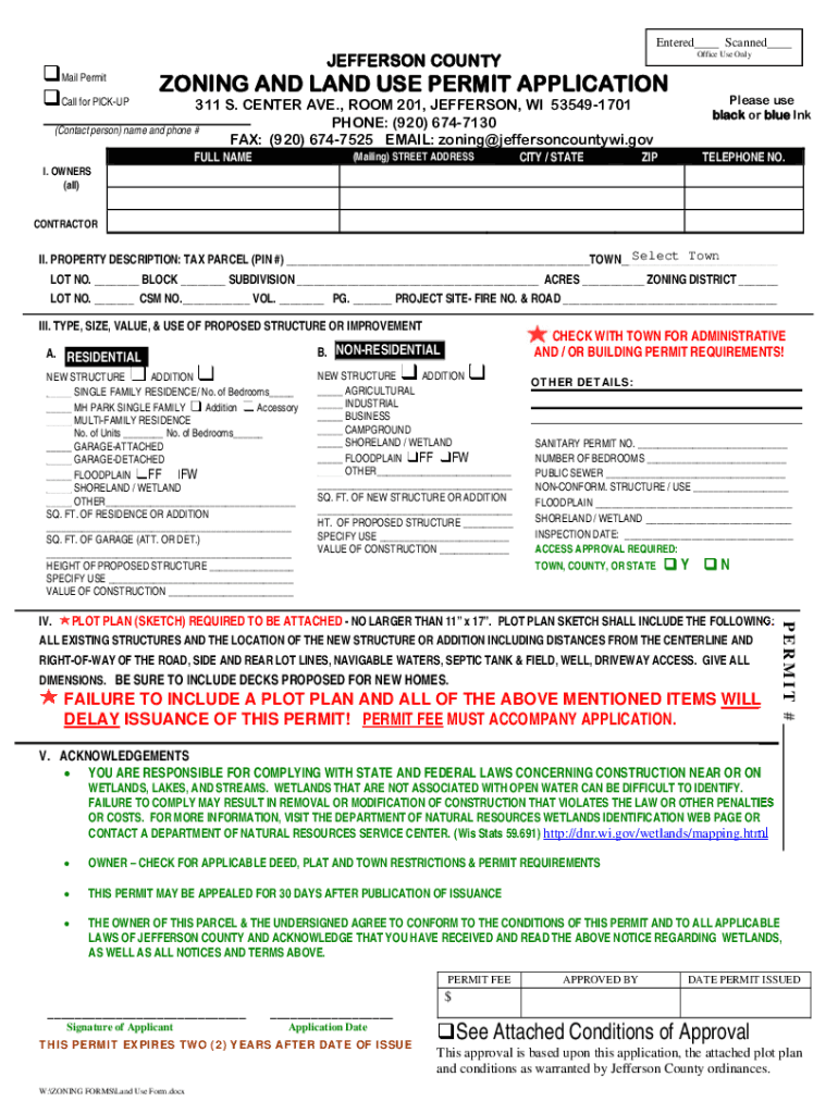 Call for PICKUPJEFFERSON COUNTYOffice Use Blazoning AND LAND USE PERMIT APPLICATION311 S. CENTER AVE., ROOM 201, JEFFERSON, WI 535491701