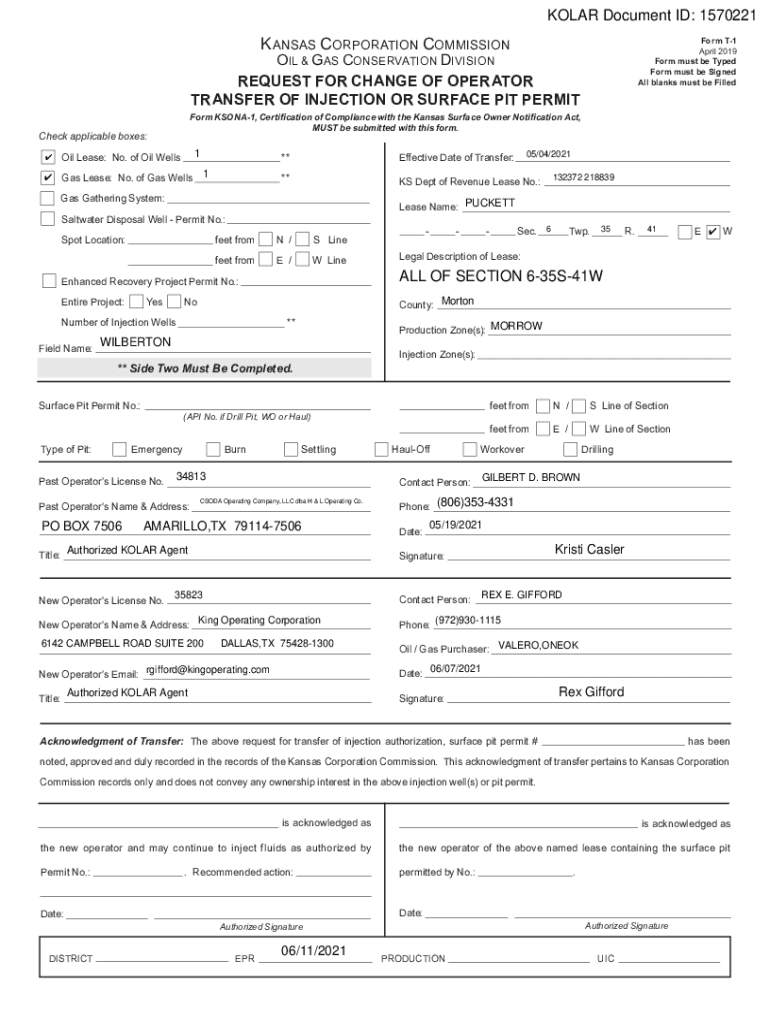 SOLAR Document ID: 1570221K KANSAS CORPORATION Commissioner T1 April 2019 Form must be Typed Form must be Signed All blanks must be Filled & GAS CONSERVATION DIVISION REQUEST FOR CHANGE OF OPERATOR