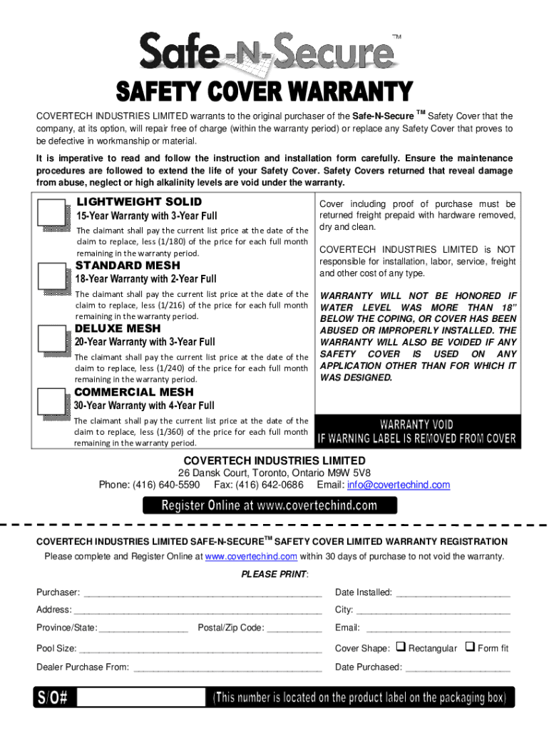 TMCOVERTECH INDUSTRIES LIMITED warrants to the original purchaser of the SafeNSecure Safety Cover that the company, at its option, will repair free of charge (within the warranty period) or replace