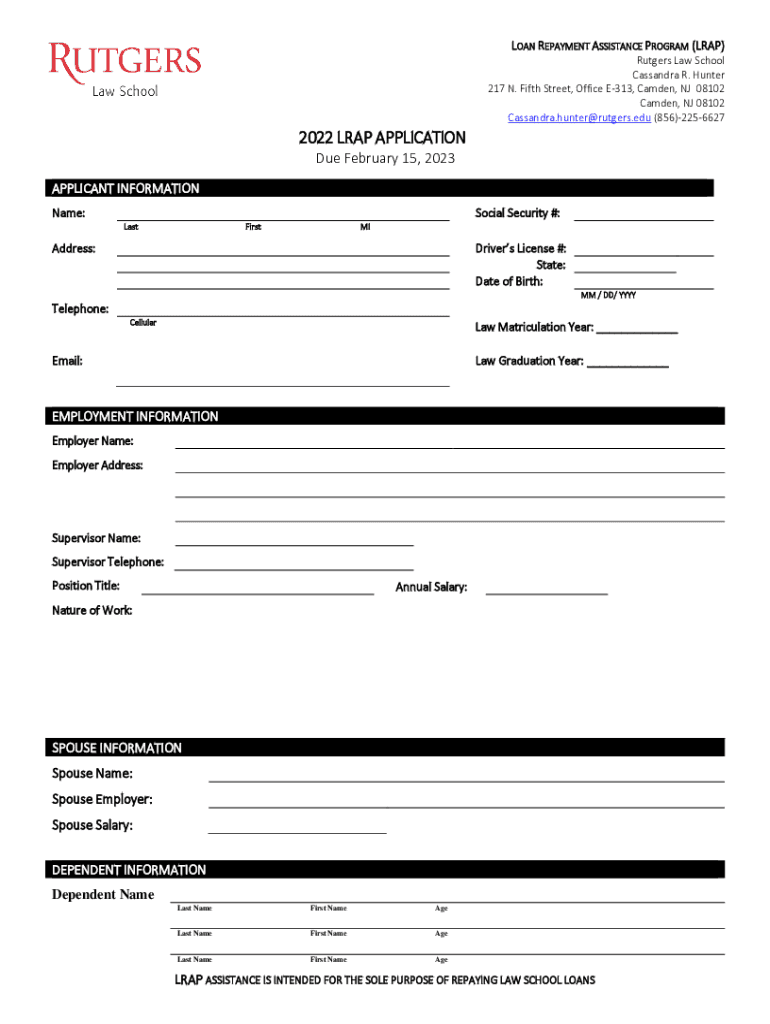 LOAN REPAYMENT ASSISTANCE PROGRAM (LAP) Rutgers Law School Cassandra R. Hunter 217 N. Fifth Street, Office E313, Camden, NJ 08102 Camden, NJ 08102 Cassandra.hunter@rutgers.edu (856)22566272022 LAP