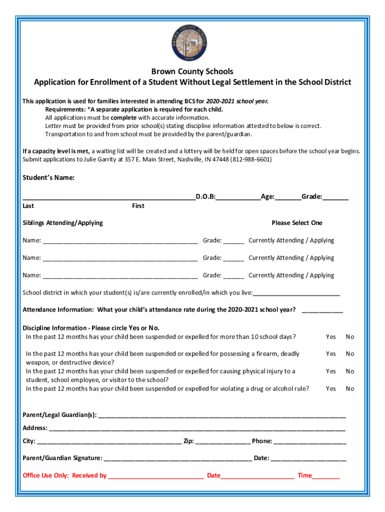 Brown County Schools Application for Enrollment of a Student Without Legal Settlement in the School District This application is used for families interested in attending BCS for 20202021 school year.