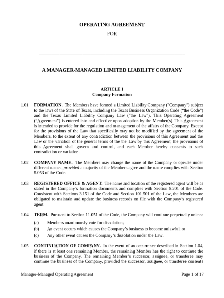 OPERATING AGREEMENT FOR ___ A MANAGERMANAGED LIMITED LIABILITY COMPANYARTICLE I Company Formation 1.01FORMATION. The Members have formed a Limited Liability Company (\” Company\”) subject to the