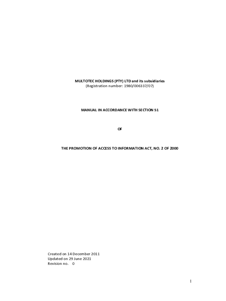 MUTATED HOLDINGS (PTY) LTD and its subsidiaries (Registration number: 1980/006337/07)MANUAL IN ACCORDANCE WITH SECTION 51OFTHE PROMOTION OF ACCESS TO INFORMATION ACT, NO. 2 OF 2000Created on 14 December