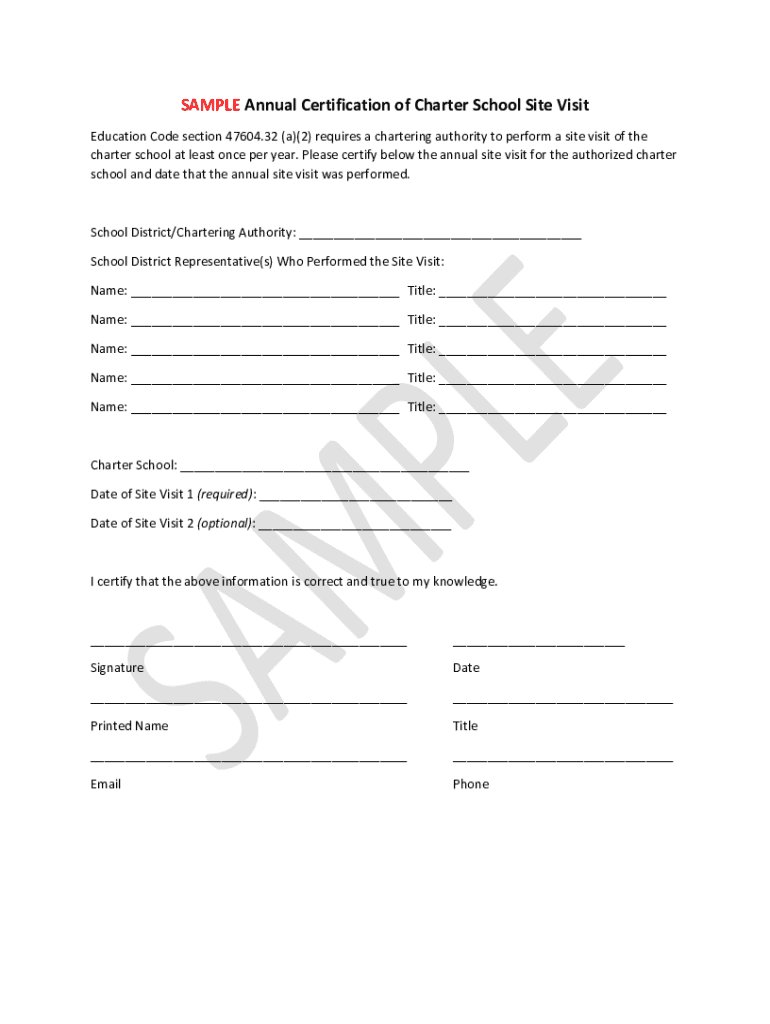Get the free SAMPLE Annual Certification of Charter School Site Visit