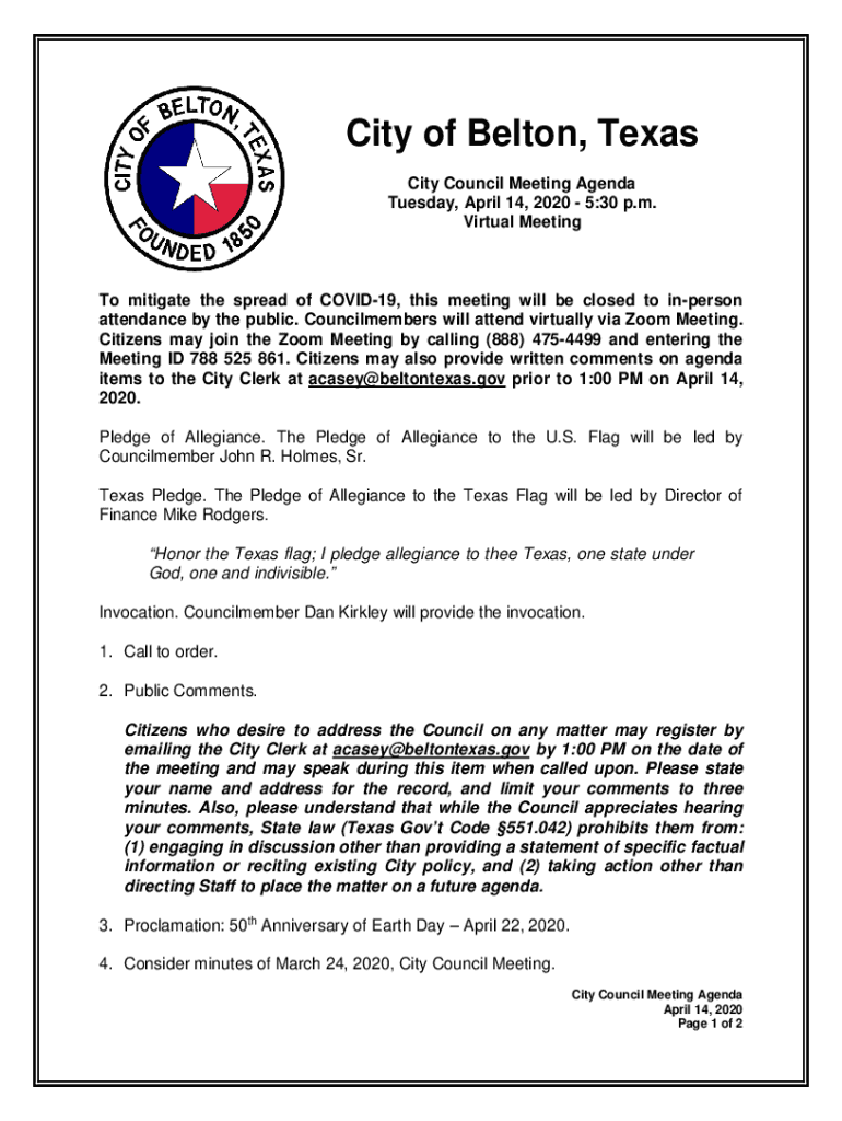 City of Belton, Texas City Council Meeting Agenda Tuesday, April 14, 2020 5:30 p.m. Virtual Meeting mitigate the spread of COVID-19, this meeting will be closed to unperson attendance by the public.