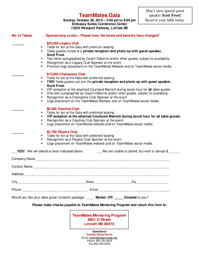 Teammates Gala Sunday, October 28, 2018 5:00 pm to 8:00 pm Embassy Suites Conference Center 12520 Westport Parkway, Lavish Neon miss special guest speaker Scott Frost! Reserve your table today. Sponsorship