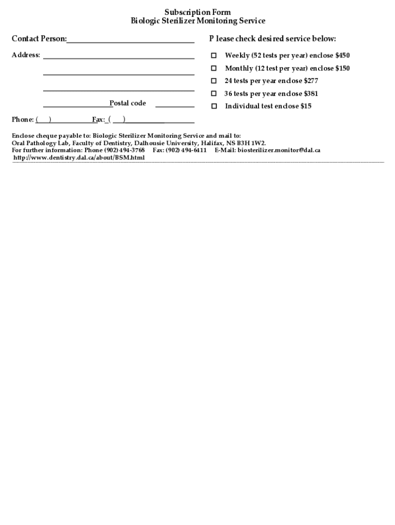 Subscription Form Biologic Sterilizer Monitoring Service Contact Person:P lease check desired service below:Address:Weekly (52 tests per year) enclose $450Monthly (12 test per year) enclose $15024