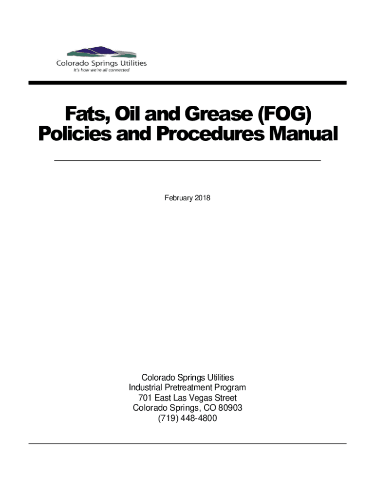 Fats, Oil and Grease (FOG) Policies and Procedures Manual February 2018Colorado Springs Utilities Industrial Pretreatment Program 701 East Las Vegas Street Colorado Springs, CO 80903 (719) 4484800.