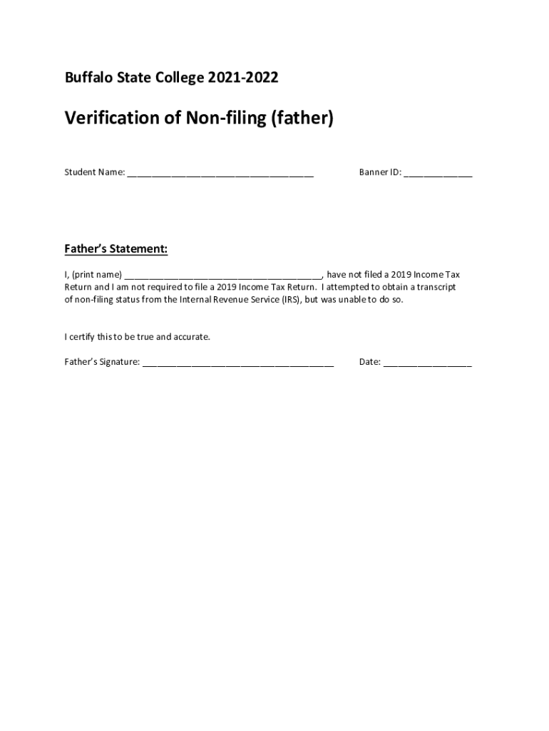 Buffalo State College 20212022Verification of Nonfiling (father) Student Name: ___Banner ID: ___Fathers Statement: I, (print name) ___, have not filed a 2019 Income Tax Return, and I am not required