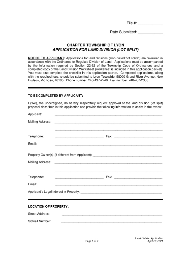 File #: ___ Date Submitted: ___CHARTER TOWNSHIP OF LYON APPLICATION FOR LAND DIVISION (LOT SPLIT) NOTICE TO APPLICANT: Applications for land divisions (also called lot splits) are reviewed in accordance