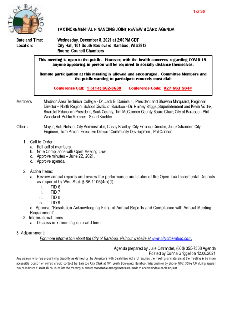 1 of 35TAX INCREMENTAL FINANCING JOINT REVIEW BOARD AGENDA