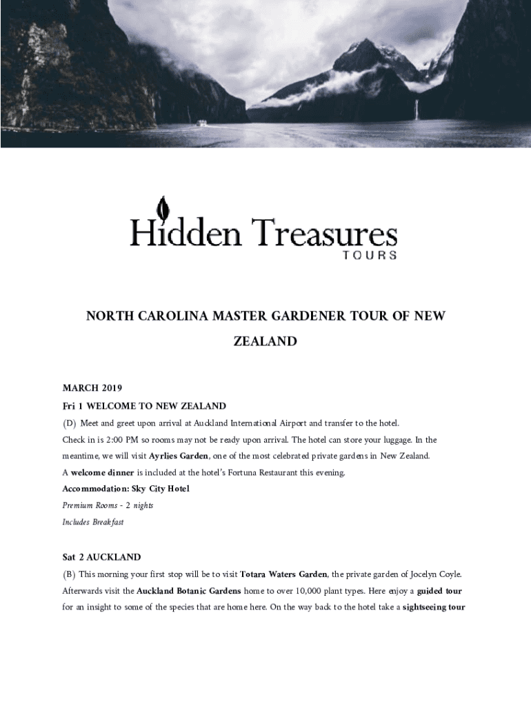 NORTH CAROLINA MASTER GARDENER TOUR OF NEW ZEALAND MARCH 2019Fri 1 WELCOME TO NEW ZEALAND(D) Meet and greet upon arrival at Auckland International Airport and transfer to the hotel. Check in is 2:00