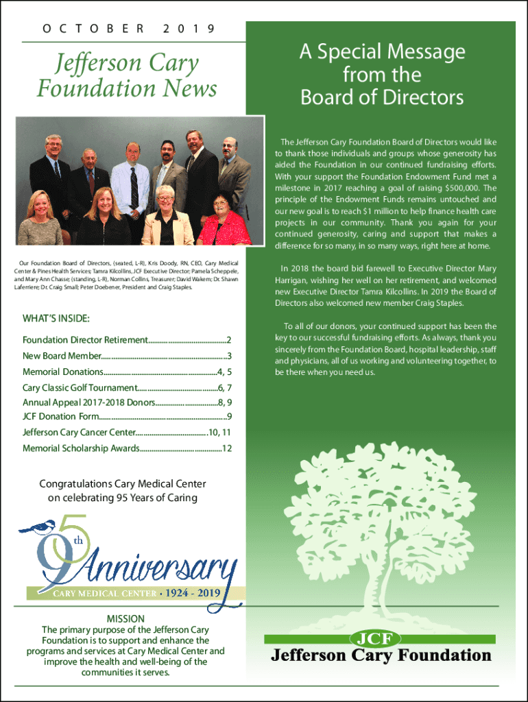O C T O B E R2 0 1 9Jefferson Cary Foundation News Special Message from the Board of Directors The Jefferson Cary Foundation Board of Directors would like to thank those individuals and groups whose